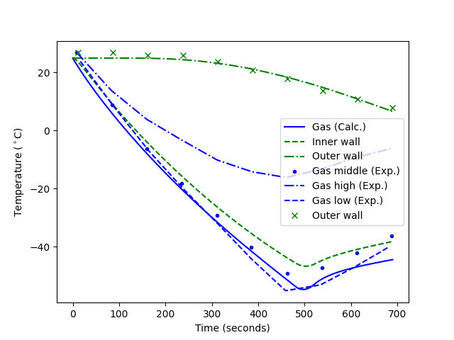 Simulation results from HydDown is compared to the experimental data of Dicken and Mérida in Figure Figure 24. As seen from the results the gas temperature calculated with HydDown is generally higher than the experimental results. The final calculated temperature is 74.2\(^\circ\)C, compared to the final measured temperature of 68.9\(^\circ\)C. The CFD calculations performed by Dicken and Mérida [DM07] was also higher than the experimental value (71.3\(^\circ\)C). Another CFD analysis of the investigated system by Hall and Ramasamy [HR24] revealed a final mean gas temperature of 71.4\(^\circ\)C, and a zero-dimensional model by the same authors gave an end temperature of 72.4\(^\circ\)C.